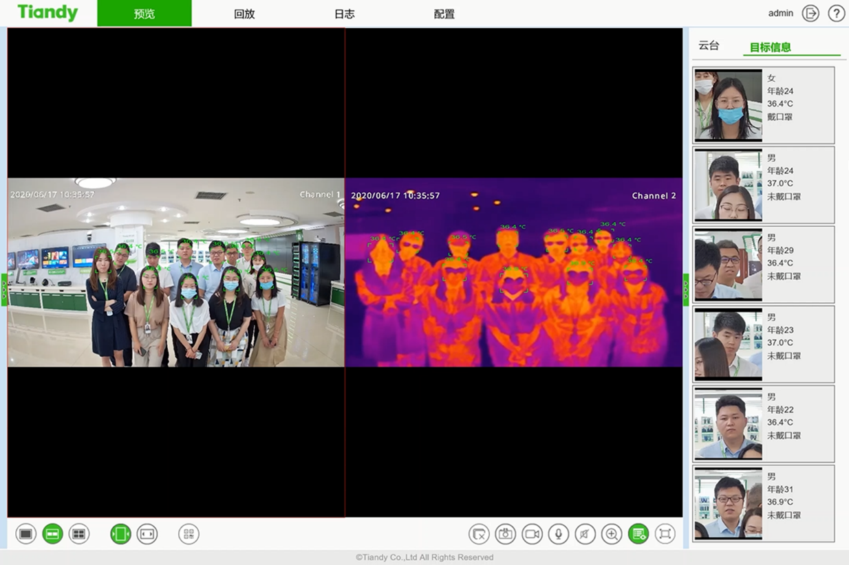 人脸识别:测温同时进行人脸抓拍,用于人员记录和识别,异常人员可以快速定位身份